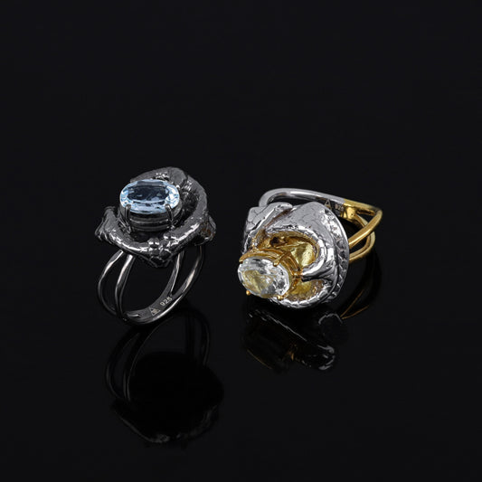 Contradictory Rings with Natural Aquamarine and Tourmalines, Gold-Plated