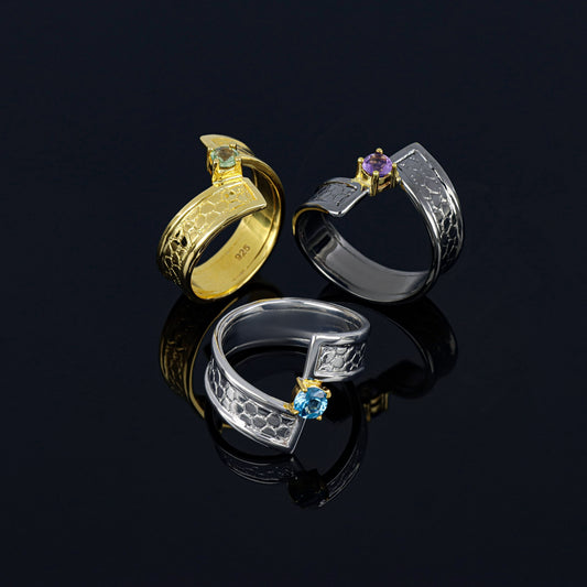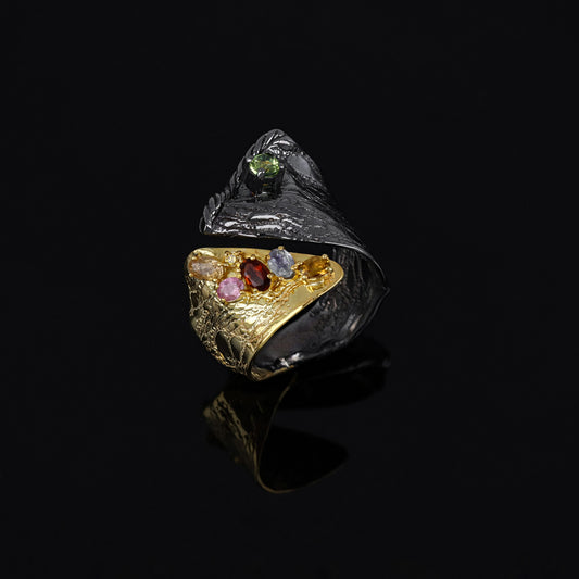 Vendor:The "Choice" handmade rings feature an elegant combination of white rhodium and gold plating, offering a sophisticated yet modern design. Embellished with natural tourmalines and a striking ametrine gemstone, these rings are dimensionless, ensuring a comfortable fit for various sizes