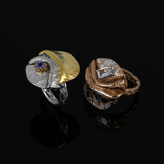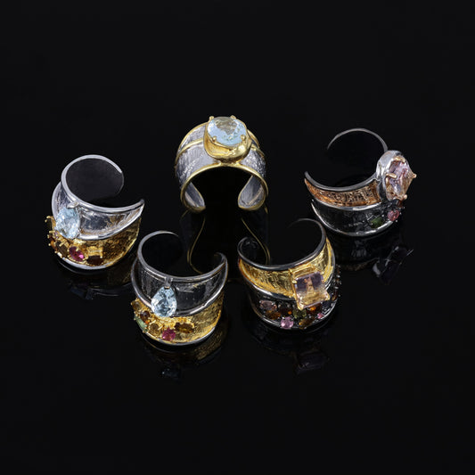 Vendor:These elegant handmade rings feature a unique "Contradictory" design, combining black and white rhodium with gold plating for a sophisticated, modern aesthetic. Adorned with natural aquamarine and tourmaline gemstones, these dimensionless rings provide a comfortable fit for a variety of sizes. A stunning addition to any jewelry collection.