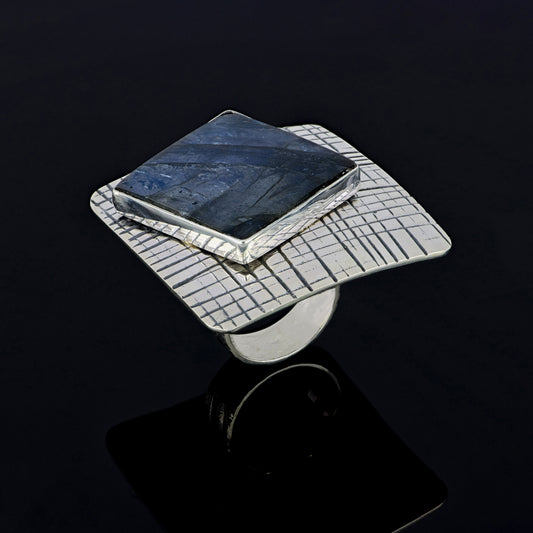 Vendor:A bold handmade statement ring featuring a large natural labradorite stone, set in textured silver for a captivating and mystical look.