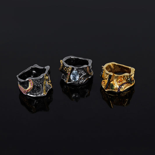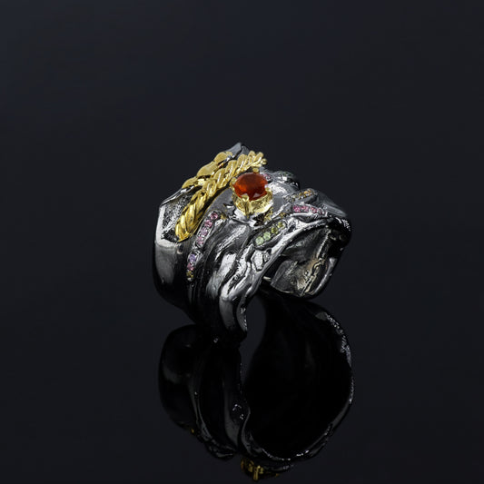 Vendor:An exquisite handmade ring featuring natural hessonite and multitourmalines, crafted with black rhodium and gold-plated finishes.