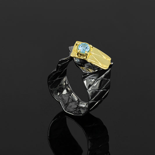 Vendor:This statement ring is crafted in a bold and contemporary design. Featuring a striking blackened silver band with a unique textured finish, it is complemented by a radiant blue topaz set in a polished gold bezel.