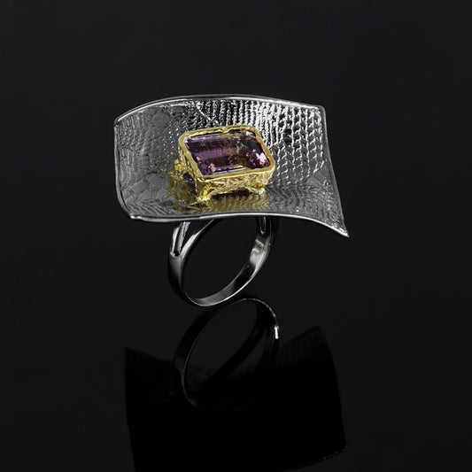 Vendor:Sterling silver with white rhodium and gold plating. Features Blue Topaz and Purple Ametrine stones. Unique floral-inspired design with textured surface. Size: 8.