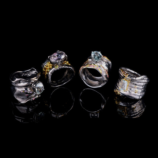 Vendor:These elegant handmade rings feature a unique "Contradictory" design, combining black and white rhodium with gold plating for a sophisticated, modern aesthetic. Adorned with natural aquamarine and tourmaline gemstones, these dimensionless rings provide a comfortable fit for a variety of sizes. A stunning addition to any jewelry collection.