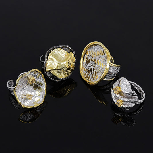 Vendor:Unique handmade adjustable rings inspired by mushrooms, featuring textured silver and gold-plated accents for a bold statement.