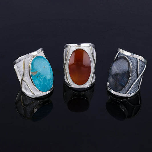 Vendor:A bold, handcrafted statement ring featuring natural turquoise, carnelian, and labradorite stones. Perfect for adding a touch of timeless elegance to any outfit.